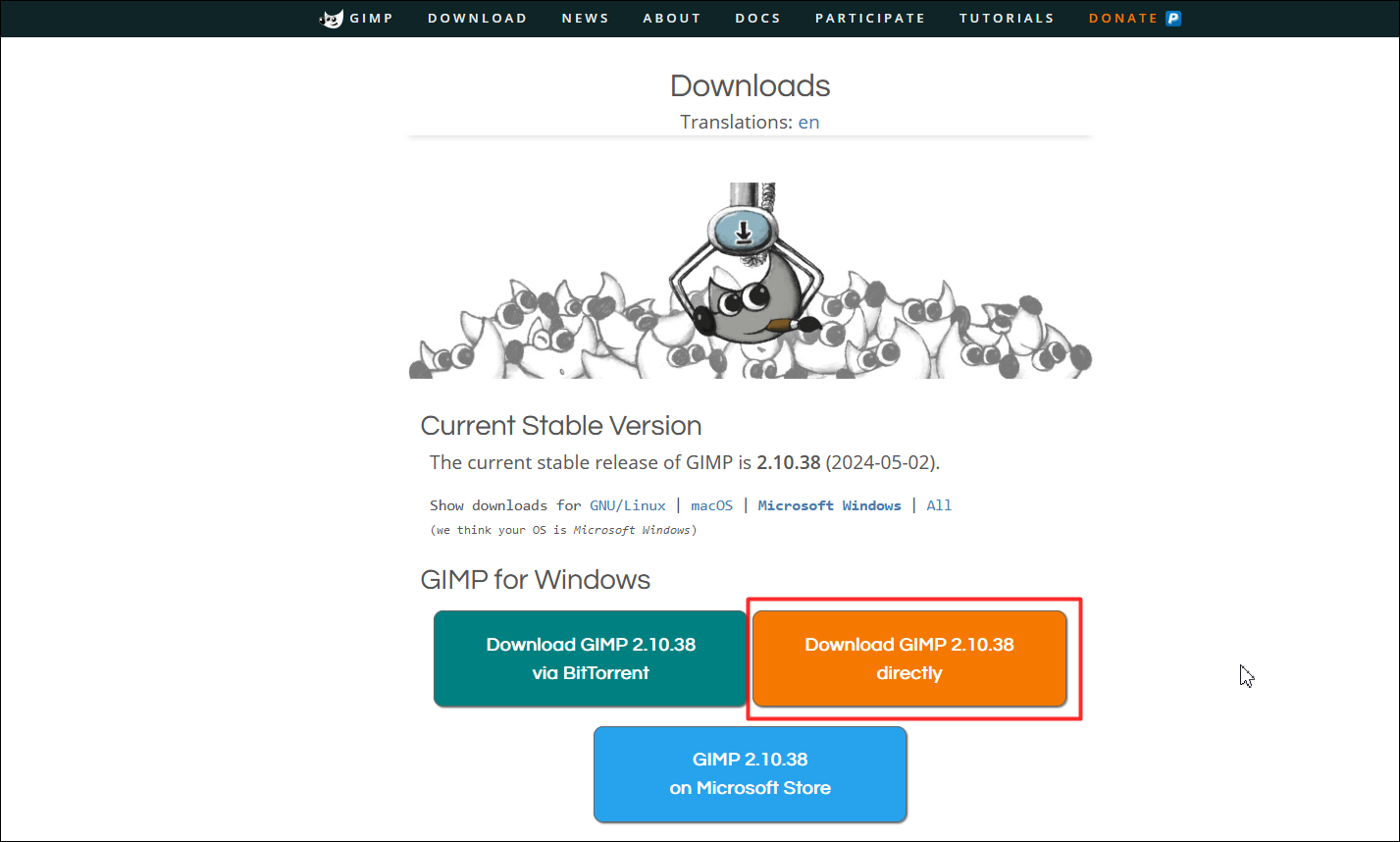 그리고 'Download GIMP 2.10.38 directly' 를 눌러 받습니다.