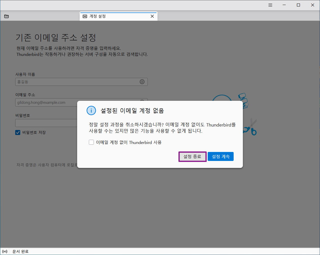 취소를 누르면 위와같이 "설정된 이메일 계정 없음" 메세지 창이 뜨는데 [설정 종료] 를 눌러줍니다.