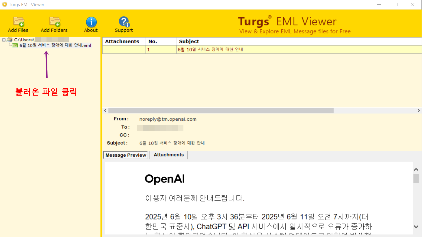 3. 전용 뷰어 프로그램(Turgs EML Viewer 등): eml 파일만을 보기 위해 제작된 경량 프로그램으로, 설치가 간단하고 이메일 내용을 빠르게 확인할 수 있습니다.