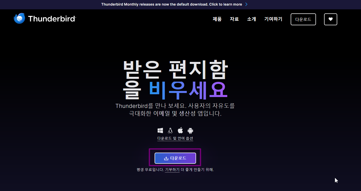 썬더버드 공식홈페이지에 접속후 메인화면에 다운로드 를 눌러다운받으시면 됩니다.
