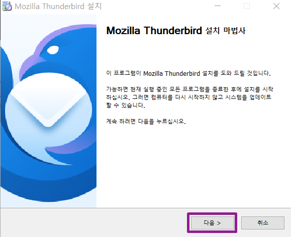 Mozilla Thunderbird 체크 상태 그대로 두고 마침을 누르면 Thunderbird가 자동 실행됩니다.