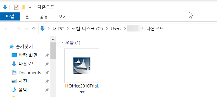 그리고 다운로드 폴더에서 다운로드한 한글2010 체험판 (HOffice2010Trial.exe) 설치 파일을 더블 클릭합니다.