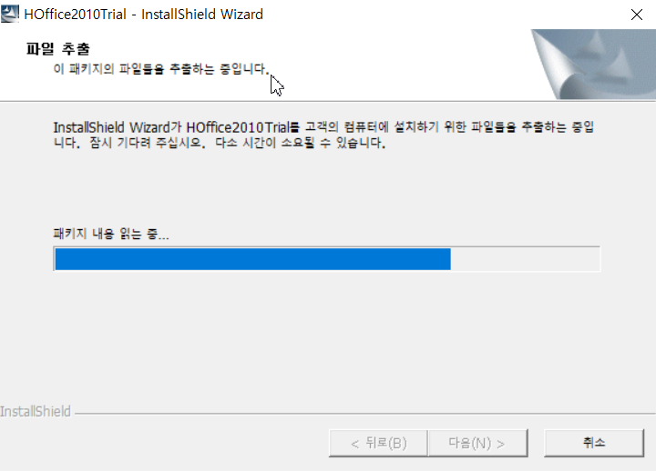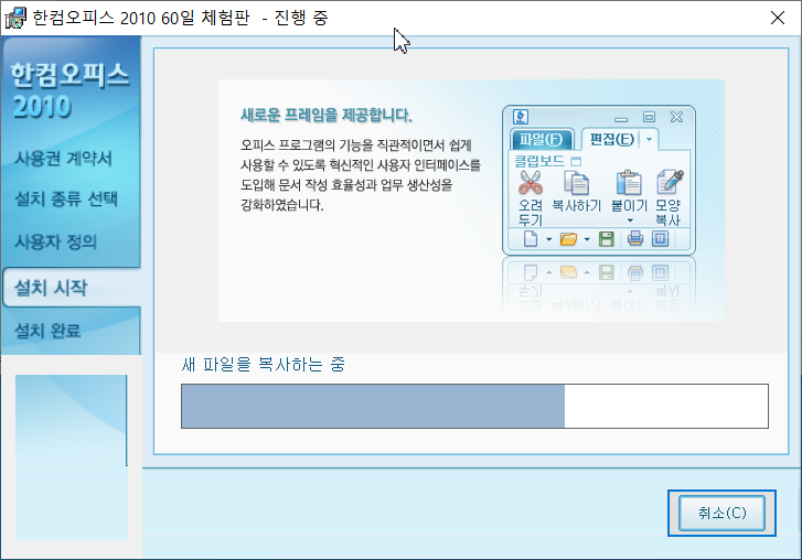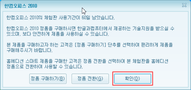 한글 2010 체험판은 정품과 동일하게 설치되지만, 실행 시 "사용 기간 안내 창"이 함께 나타납니다.