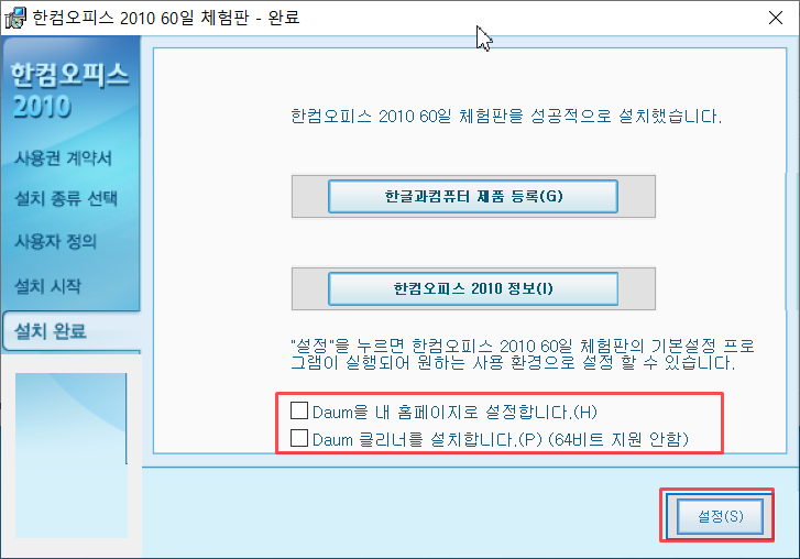 설치 완료되면 "Daum을 내홈페이지로 설정합니다., Daum클리너 를 설치합니다. "이 부분은 필수 설치가 아니라 선택 설치라는 것입니다. 기본적으로 체크가 되어 있어서 그대로 두면 웹 브라우저에 Daum 관련 바로가기와 Daum 클리너가 함께 설치됩니다. 반드시 체크를 해제한 뒤, ‘설정’ 버튼을 눌러 줍니다..