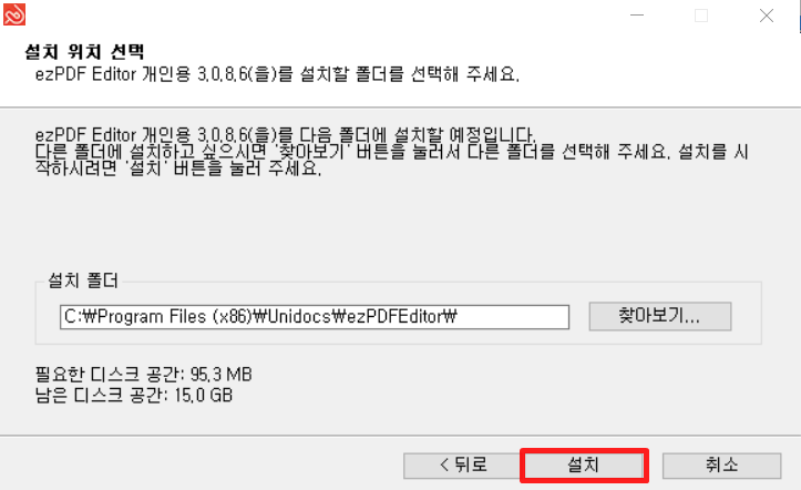 4. 기본 경로는 `C:\Program Files\Unidocs\ezPDFEditor 로 설정되어 있습니다.