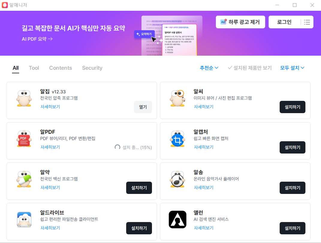 이후 알매니저 창이 표시되면서 알PDF 설치 화면이 나타납니다.