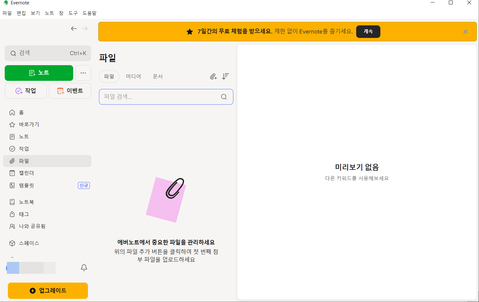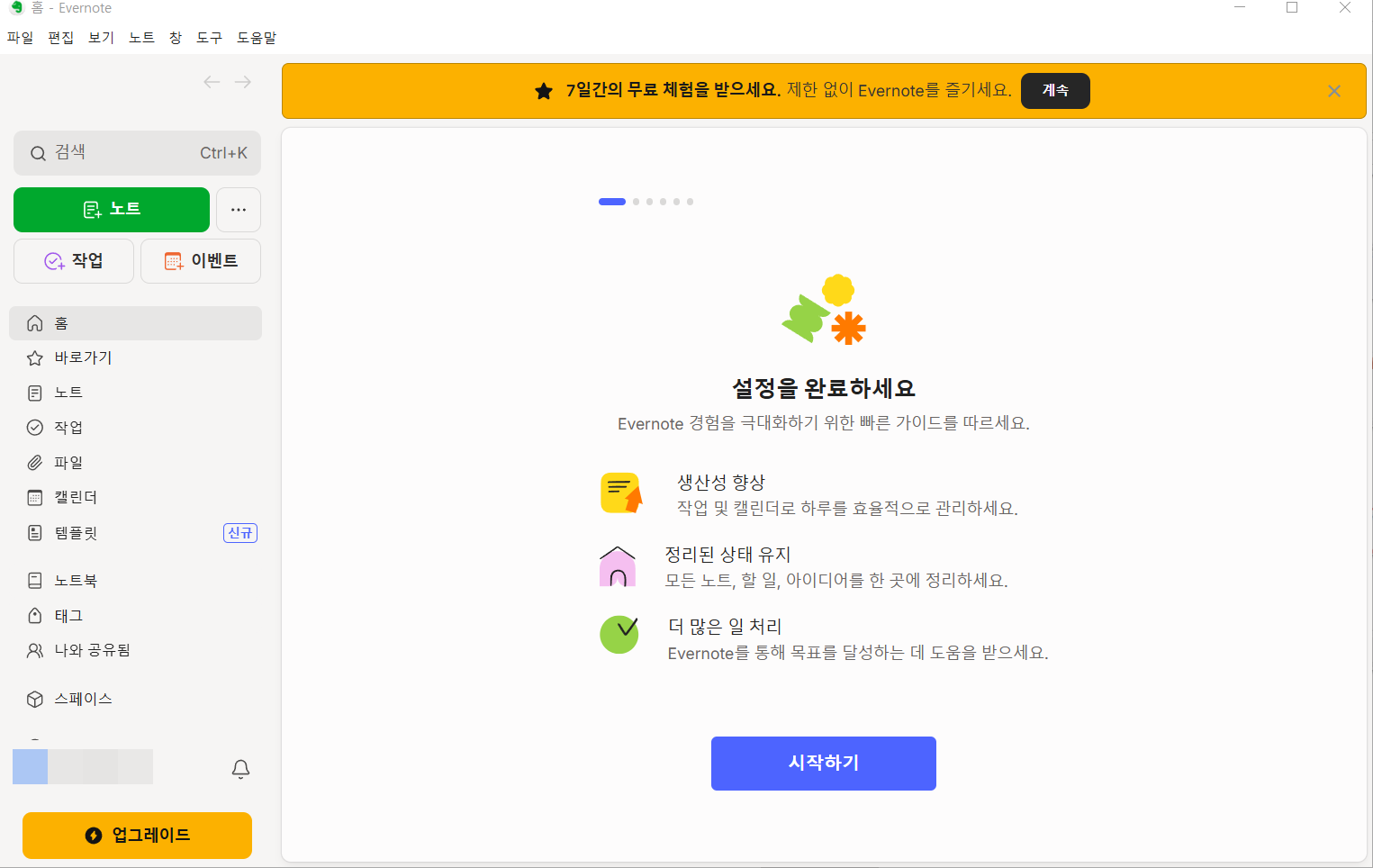 에버노트 프로그램이 실행되면 다음과 같은 초기 화면이 표시됩니다.