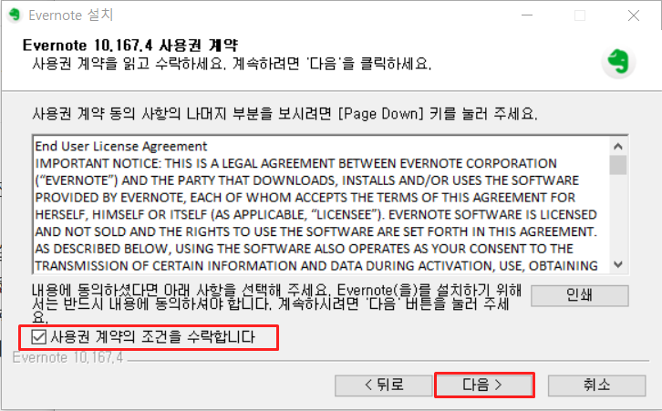Evernote 사용권 계약 화면이 나타나면 ‘사용권 계약의 조건을 수락합니다.’ 항목에 체크해 주시기 바랍니다.