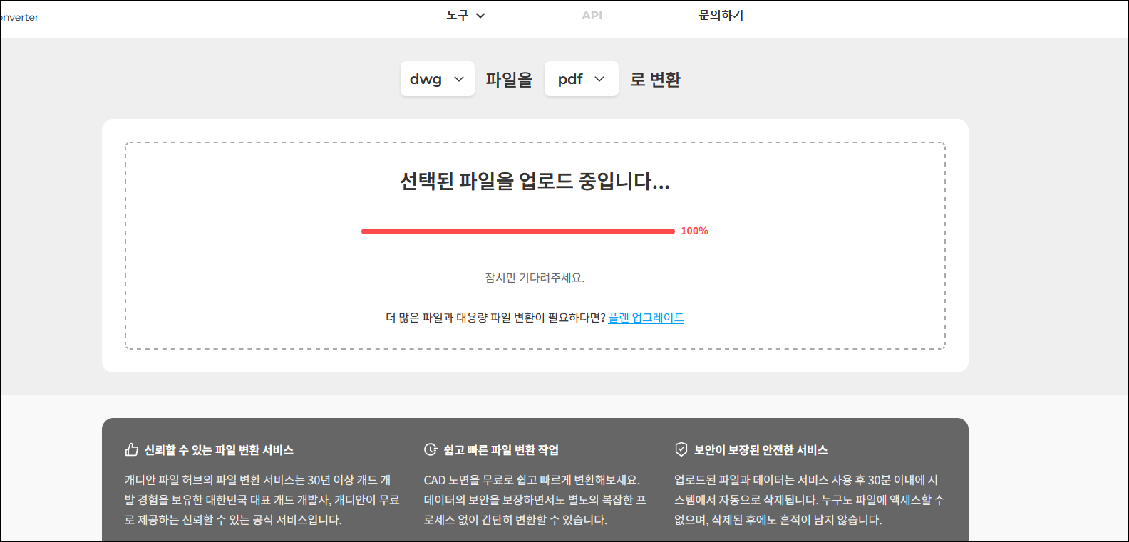 장점으로는 설치가 필요 없어 설치 환경이 제한적인 장비에서도 사용할 수 있고, 별도의 CAD 라이선스가 없는 사용자라도 CAD 도면을 간단히 변환할 수 있다는 점입니다. 또한 파일을 변환하는 과정이 직관적이어서 초보자라도 쉽게 사용할 수 있고, 브라우저만 있으면 되기 때문에 플랫폼에 구애받지 않는다는 편리함이 있습니다.