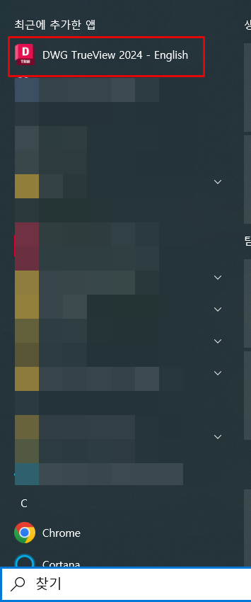 PC를 부팅한 뒤 시작 메뉴를 열어 ‘DWG TrueView 2024 – English’를 선택하여 프로그램을 실행해 주세요.