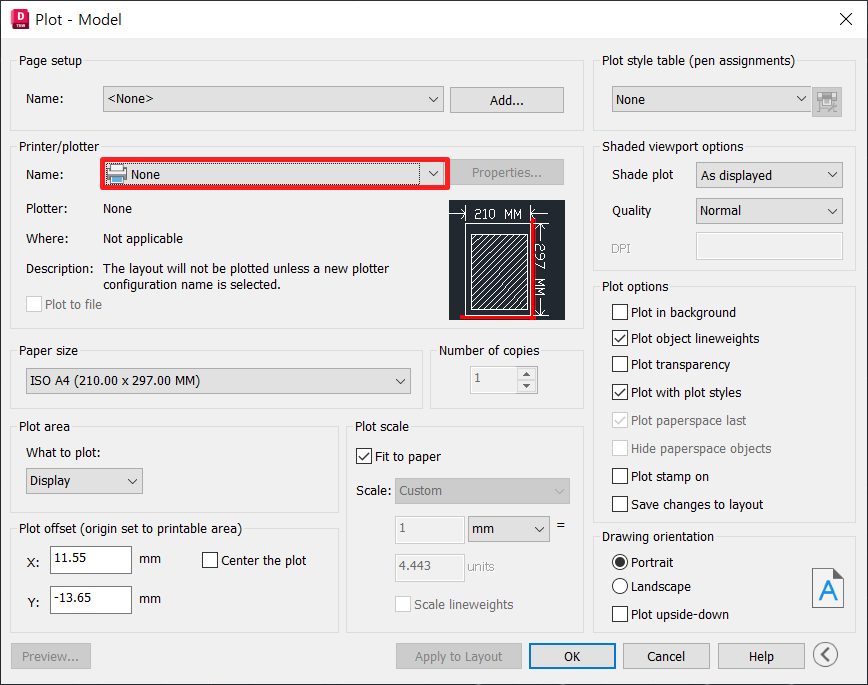 프린터/플로터(Printer/Plotter) 항목의 이름(Name) 드롭다운 목록에서