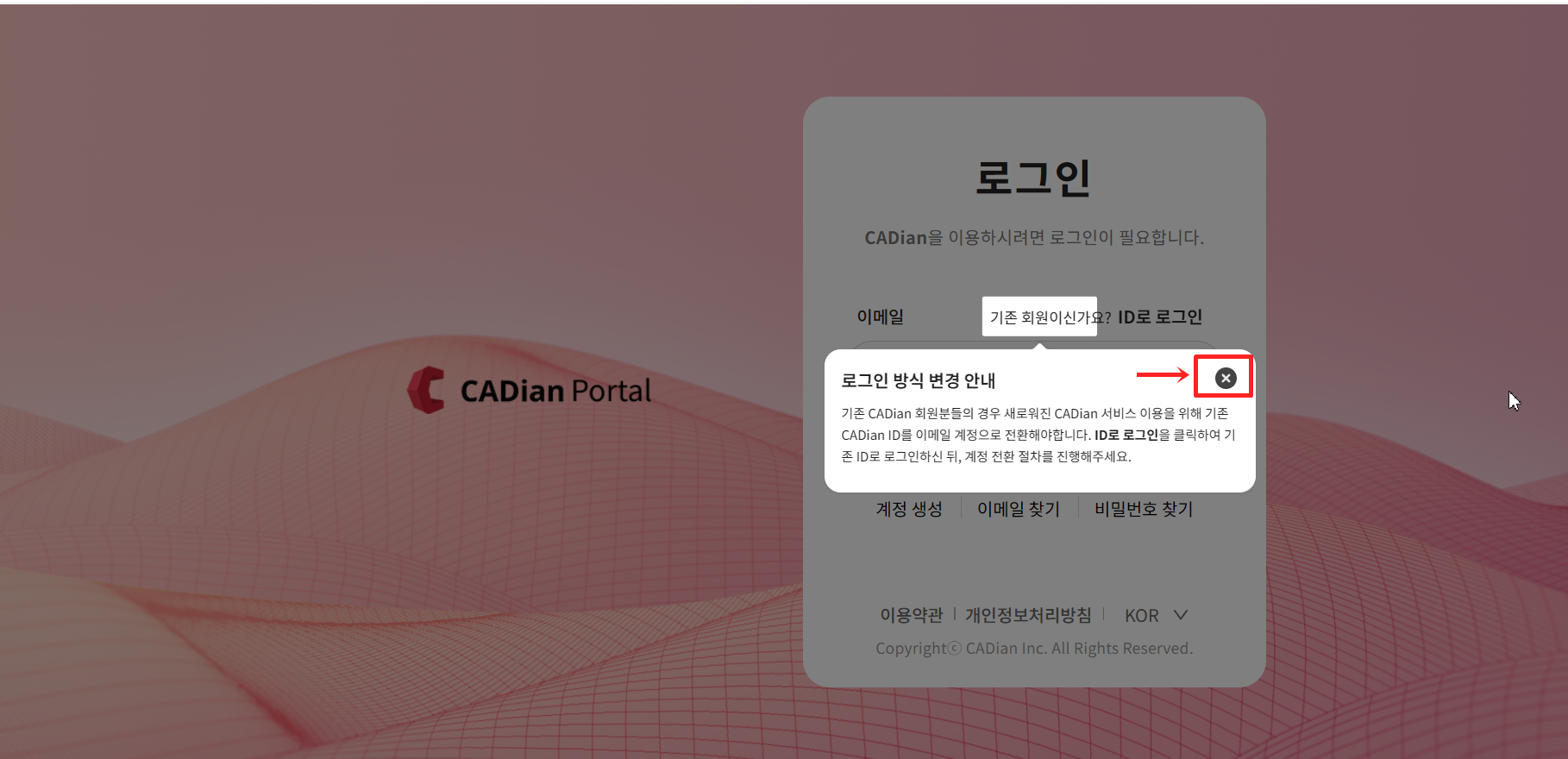 로그인 페이지로 이동되면 "로그인 방식 변경 안내" 팝업창이 나오는데 x 를 눌러 닫아줍니다.