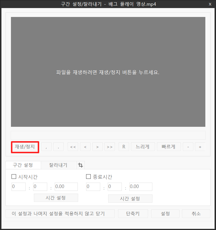 자르고 싶은 시작 지점에서 [재생/정지] 버튼을 눌러 영상을 멈춘 후, ‘시작 시간’ 아래에 있는 [시간 설정] 버튼을 눌러 시작 시간을 지정하시면 됩니다.