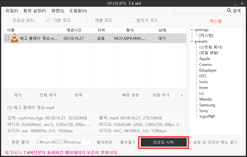 모든 설정이 완료되면 하단의 ‘인코딩 시작’ 버튼을 클릭합니다.