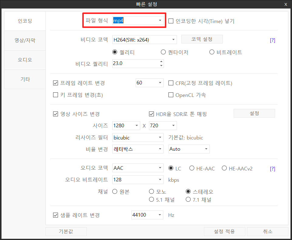 일반적으로 출력 포맷은 MP4(H.264) 형식을 많이 사용하며, AVI 로 되어있는것을 MP4로 변경해줍니다.